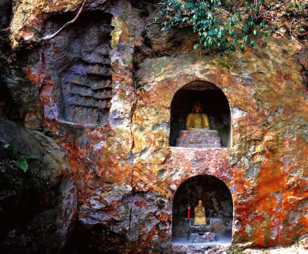明代摩崖石刻,位于牛首山東峰兜率巖北崖,距弘覺寺塔約一百米。崖壁上共開鑿5個佛龕,北壁3個,東壁2個,共有133尊雕像。石刻整體呈“幾”字形,三面巖石南北長11.5米,東西寬5.8一8米,中間圍合成約77平方米的平地空間,正窟面對祖堂山主峰獻(xiàn)花巖。石刻包括佛像、題刻。5座佛龕內(nèi)每座佛龕所雕數(shù)目不等。在石壁正中一龕里,僅雕釋迦牟尼像,高1.78米,結(jié)跏趺壘,施禪定印,下為高0.39米仰覆蓮須彌座,雕刻較為粗糙。在龕外左右兩壁上刻有記載牛首山“敕賜弘覺禪寺”所屬范圍的文字。距該龕東西兩側(cè)約3米處各有一龕,東龕上下九層共75尊,最下層為環(huán)立武僧。上面皆為盤膝打坐的修士,但絕大多數(shù)已有損毀。西龕則雕鑿在“幾”字形的側(cè)壁上,其內(nèi)容、風(fēng)格與東龕相同。在西龕的下部相距高約0.39米處,另有一小龕,內(nèi)鑿高0.45米的彌勒像一尊,藝術(shù)造詣較高于其他諸像,且龕外石壁右側(cè)刻有“大明成化元年歲次乙酉五月五日口口真定成造彌勒佛一尊永遠(yuǎn)供養(yǎng)”的題記。佛龕兩側(cè)尚刻有四處梵文,其東壁南側(cè)的巖石上,鐫一行梵文,寬約1.6米,另有《題感應(yīng)泉詩》一首,詩系刻在石壁上,長0.5米,寬0.32米,每字約4厘米,有11行,滿行8字,共83字,除去4字已剝蝕外,其余79字清晰可辨。