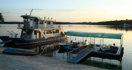 凈月潭水上游覽船舶集水上交通運(yùn)輸、游覽于一體。從任何一處碼頭上船都可以通向風(fēng)景區(qū)的幾個(gè)主要景點(diǎn):大壩碼頭、沙灘浴場(chǎng)碼頭、橡樹(shù)灣碼頭(森林浴場(chǎng))、滑雪場(chǎng)。凈月潭現(xiàn)有兩艘主要船舶。其中“乘風(fēng)號(hào)”游船系雙層雙體燃?xì)猸h(huán)保型游覽船舶,定員 100位。游客可在乘坐游船的同時(shí)觀賞凈月潭水的秀色。而“麒龍?zhí)枴笔且凰椰F(xiàn)代船舶,客艙內(nèi)配有電視、音樂(lè),為游客播放凈月潭相關(guān)視頻,二層甲板處更是觀光遠(yuǎn)眺凈月風(fēng)景的好地方。凈月潭又從日本購(gòu)進(jìn)多輛三座位的“水上摩托艇”,速度快、較刺激,可供游客自行駕駛。由“摩托艇”牽引,游人還可踩滑水板滑翔于潭面。由“快艇”牽引,乘坐五座位的火箭沖浪艇,也極具刺激性。