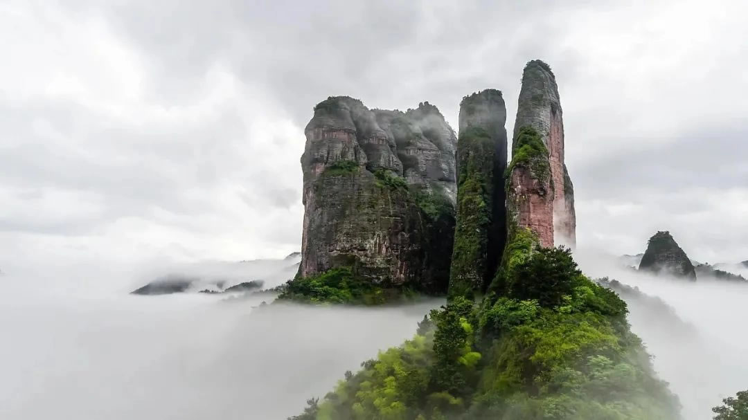 • 特色:江郎山的標(biāo)志性景觀,由三塊巨石組成,形似石筍天柱,被譽(yù)為“神州丹霞第一峰”。