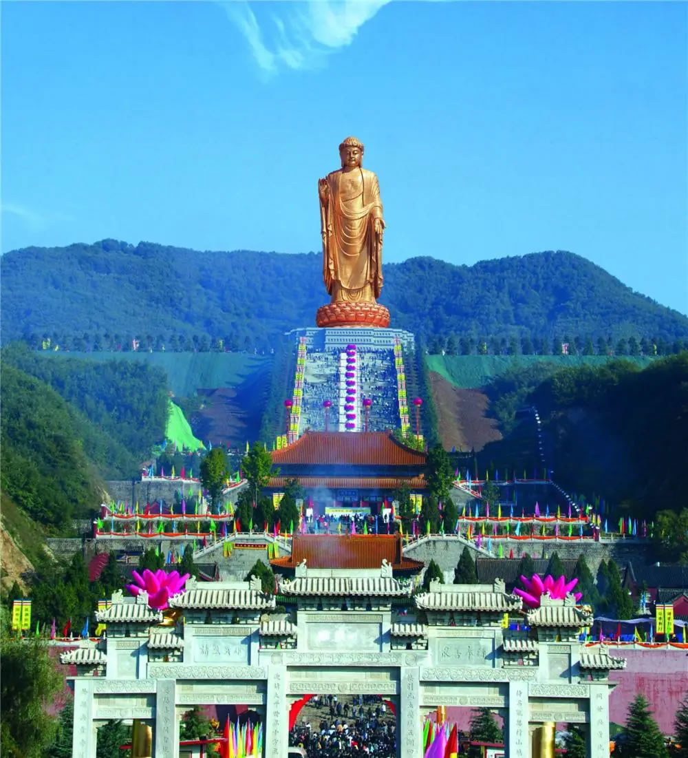 中原大佛景區(qū)位于河南省平頂山市魯山縣境內(nèi),地處伏牛山生態(tài)旅游黃金位置,景區(qū)規(guī)劃面積13.40平方千米。中原大佛景區(qū)由牌坊、佛泉寺、愿心臺(tái)、;鄞蟮、禮佛臺(tái)、中原大佛、吉祥鐘、佛教文化宮殿、文化碑廊等景點(diǎn)景觀組成。大佛總高208米,身高108米,蓮花座高20米,金剛座高25米,須彌座高55米,中原大佛整體佛像鑄造用銅3300噸,黃金108公斤,特殊鋼15000余噸,表面面積為11300平方米,通過焊接13300塊銅板而成。景區(qū)內(nèi)的天瑞吉祥金鐘凈重116噸,是載入《吉尼斯世界紀(jì)錄大全》的“世界最大外擊青銅鑄鐘”,世界佛光總會(huì)會(huì)長、臺(tái)灣佛光山開山宗長星云大師為大佛題寫“世界第一中原大佛”大字,大佛前還有有四季長流的沙河圣水,佛泉湯、佛泉寺、中原釋迦大佛、天瑞吉祥鐘等景觀。