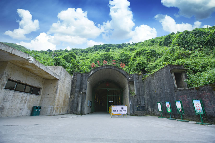 重慶816工程遺址,位于重慶市涪陵區(qū)白濤街道,緊鄰烏江,背靠武陵山。1966年由中央軍委、周恩來總理批準(zhǔn)建設(shè),該工程打山洞用時8年,安裝設(shè)備用時9年,總投資7.46億元人民幣。先后投入6萬多人參與建設(shè),工程歷經(jīng)急建、緩建、停建和轉(zhuǎn)產(chǎn)4個階段,1984年因國家戰(zhàn)略調(diào)整,工程停建。2002年國防科工委同意對816工程解密。816工程遺址軸向疊加全長20余千米,完全隱藏在山體內(nèi)部,洞內(nèi)冬暖夏涼,四季恒溫?偨ㄖ娣e10.4萬平方米,主洞室高達(dá)79.6米,拱頂跨高31.2米,洞內(nèi)有大型洞室18個,道路、導(dǎo)洞、支洞、隧道及豎井130多條,建筑布局宛如迷宮,洞中有洞,洞中有樓,樓中有洞。