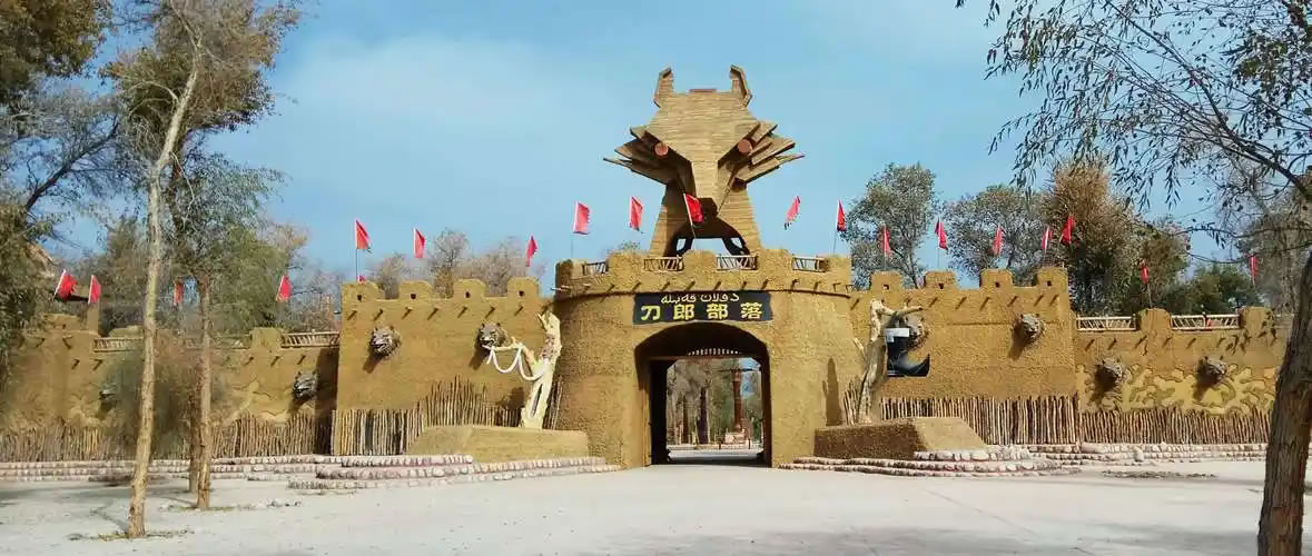 刀郎部落,位于新疆維吾爾自治區(qū)阿克蘇地區(qū)阿瓦提縣玉滿(mǎn)閘口胡楊林區(qū),距阿克蘇市58公里、縣城18公里,占地面積8300畝。景區(qū)以5000余畝千年原始胡楊林為生態(tài)背景,完整呈現(xiàn)刀郎人建筑、飲食及民俗文化,集中展示刀郎木卡姆、刀郎麥西熱甫等8項(xiàng)國(guó)家級(jí)和自治區(qū)級(jí)非物質(zhì)文化遺產(chǎn),其中“刀郎演唱組合”保持著最大年齡民間歌舞組合的大世界基尼斯紀(jì)錄。核心功能區(qū)包含民俗展館、千年胡楊區(qū)、鴕鳥(niǎo)養(yǎng)殖園區(qū)等七大板塊,復(fù)原刀郎人傳統(tǒng)居所與勞作工具,設(shè)有傳統(tǒng)手工藝作坊和勇士競(jìng)技場(chǎng),每日開(kāi)展刀郎麥西熱甫展演、民俗婚禮體驗(yàn)及摔跤、叼羊等傳統(tǒng)體育活動(dòng)。2025年入選非遺進(jìn)景區(qū)“五好”案例名單,通過(guò)非遺傳承人駐場(chǎng)表演、慕薩萊思釀造工藝展示及沙雕主題公園等特色項(xiàng)目,形成生態(tài)觀光與民俗體驗(yàn)深度融合的旅游模式。景區(qū)內(nèi)保留狩獵場(chǎng)景、農(nóng)民畫(huà)長(zhǎng)廊及高空輪轉(zhuǎn)秋千表演,配套沉浸式互動(dòng)體驗(yàn)和文創(chuàng)開(kāi)發(fā)體系,實(shí)現(xiàn)刀郎文化的活態(tài)傳承。