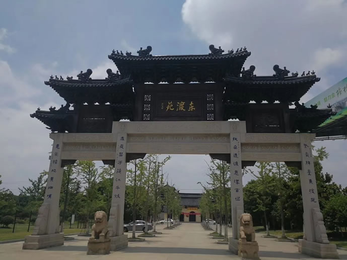 東渡苑景區(qū)位于江蘇省蘇州市張家港市塘橋鎮(zhèn),地處204國道與338省道交匯處,占地面積95300 m²。該地為公元753年唐代高僧鑒真第六次東渡日本成功的啟航地,古稱黃泗浦。據(jù)《沙洲縣志》記載:"唐高僧鑒真東渡日本連續(xù)五次失敗后,第六次于黃泗浦口啟航東渡成功。"1963年設立石質(zhì)經(jīng)幢作為紀念。景區(qū)包含鑒真東渡紀念館、東渡寺、碑亭等仿唐建筑群,其中主館供奉高2.06米的鑒真銅像,壁畫展現(xiàn)其第六次東渡歷程,后方木刻書屏節(jié)選《東征傳》記載第六次東渡細節(jié)。遺址區(qū)發(fā)現(xiàn)唐代河道、寺院類建筑遺存及石佛雕像,出土長沙窯執(zhí)壺等外銷瓷器和宋代銘文磚,2013年列為全國重點文物保護單位,2018年入選全國十大考古新發(fā)現(xiàn)。景區(qū)現(xiàn)存東渡橋橫跨黃泗浦兩岸,橋側碑亭刻有阿倍仲麻呂詩作及郭沫若題詩,種植雪松、桂花等50余種植物構成江南水鄉(xiāng)景觀。