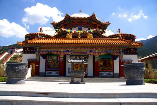 廣宗寺,其整個(gè)建筑氣勢(shì)宏偉,富麗堂皇。主要建筑有大雄寶殿、大經(jīng)堂、黃樓寺等。其中供奉西藏第六世達(dá)賴(lài)?yán)镞z體寶塔的大殿稱(chēng)為“黃樓寺”。黃樓寺是一座兩層樓閣的建筑,其前部為81間,后部為49間,全部用黃、綠色琉璃瓦砌成,極為富麗。