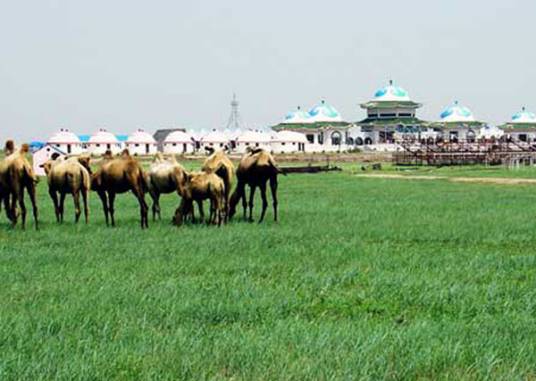 旅游區(qū)占地6000畝,總建筑面積為3260平方米,整體設(shè)計(jì)突出民族特色;五個(gè)殿堂式迎賓包,坐落在1.3米高的平臺(tái)上,氣勢(shì)磅礴,造型典雅,富麗堂皇,兩側(cè)是18個(gè)豪華型固定包和14個(gè)傳統(tǒng)氈包,組成蒙古包群。建筑的正南面是周長(zhǎng)為1000米的賽馬場(chǎng),通遼市一年一度的賽馬節(jié)就在這里舉行。
