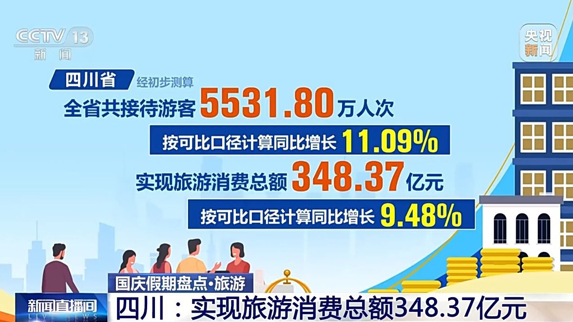 四川省經(jīng)初步測算,全省共接待游客5531.80萬人次,實(shí)現(xiàn)旅游消費(fèi)總額348.37億元,按可比口徑計(jì)算,同比分別增長11.09%和9.48%。全省核心旅游景區(qū)“狀態(tài)拉滿”,17家5A級景區(qū)累計(jì)接待游客426.93萬人次、實(shí)現(xiàn)門票收入1.85億元,同比分別增長25.06%和15.48%,超越假日歷史最高水平。九寨溝景區(qū)連續(xù)4天均達(dá)4.1萬人承載量上限。
