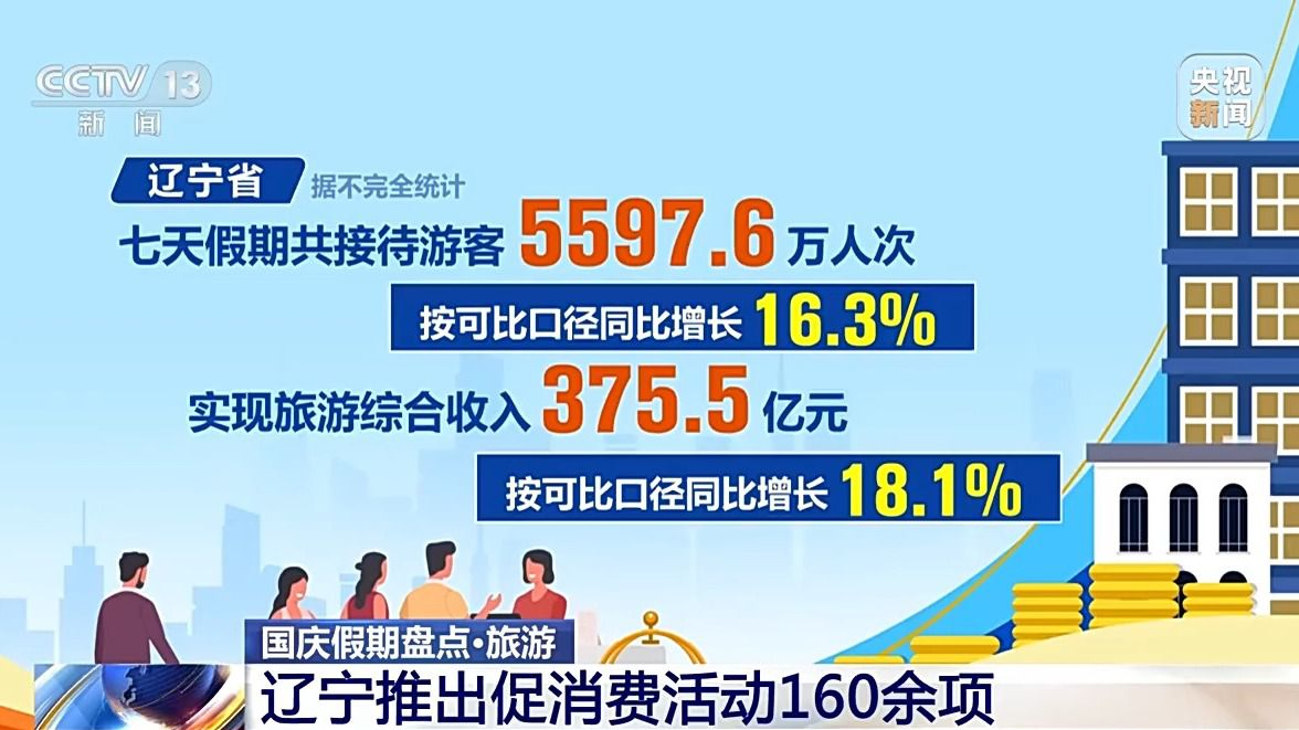 遼寧省據(jù)不完全統(tǒng)計(jì),七天假期共接待游客5597.6萬人次,按可比口徑同比增長16.3%,實(shí)現(xiàn)旅游綜合收入375.5億元,按可比口徑同比增長18.1%。假期里遼寧省推出促消費(fèi)活動160余項(xiàng),全省各地舉辦文化藝術(shù)、群眾文化、非遺、文博等各類活動600余場,通過線上線下聯(lián)動的方式,豐富人們假日文化生活。