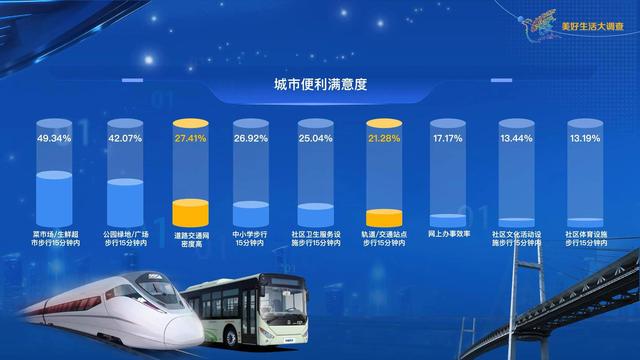 交通的改善大大提高了生活的便利度。其中,道路網(wǎng)密度高和軌道/交通站點步行15分鐘內(nèi)這兩項的滿意度都位居城市便利度方面的第二梯隊。