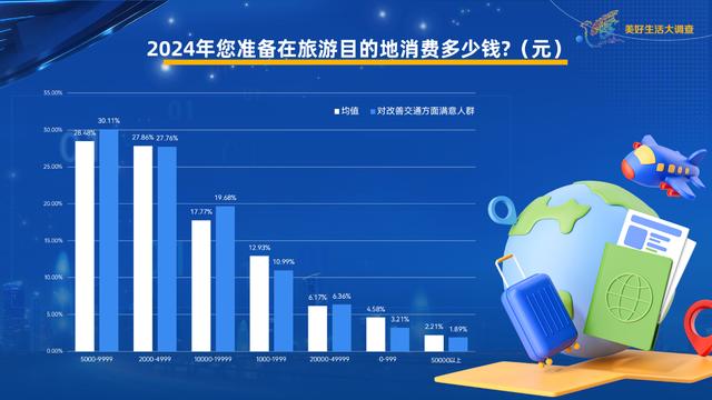 《美好生活大調(diào)查》發(fā)現(xiàn),對交通方面滿意人群,預計旅游消費在5000至9999元和10000至19999元的占比都高出均值2個百分點。