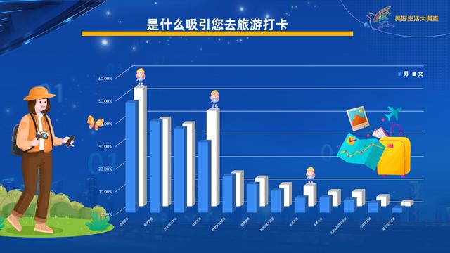 《美好生活大調(diào)查》發(fā)現(xiàn),自然景觀是吸引大家去旅游打卡的最主要因素,有將近一半的人會因此選擇旅游目的地。名勝古跡、歷史民俗文化和特色美食緊隨其后。不同人群中,女性對城市的特色美食超級偏愛,因為特色美食去一個城市旅游的女性占比高出男性11個百分點以上。跟女性相比,男性對名勝古跡和特色民宿/酒店更感興趣一點。