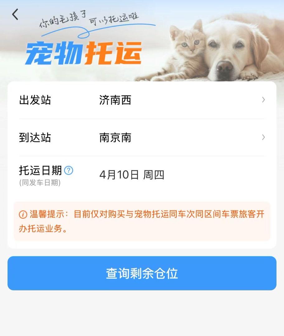 記者查詢鐵路12306App發(fā)現(xiàn),在“全部應(yīng)用”頁(yè)面“精選應(yīng)用”板塊,“寵物托運(yùn)”功能已經(jīng)上線。點(diǎn)擊“預(yù)約下單”,填寫(xiě)選擇出發(fā)站、到達(dá)站以及托運(yùn)日期后,再點(diǎn)擊“查詢剩余倉(cāng)位”,托運(yùn)旅客即可查詢剩余寵物倉(cāng)位,并從車票訂單或本人車票中選擇已購(gòu)買(mǎi)的車票信息進(jìn)行關(guān)聯(lián)。