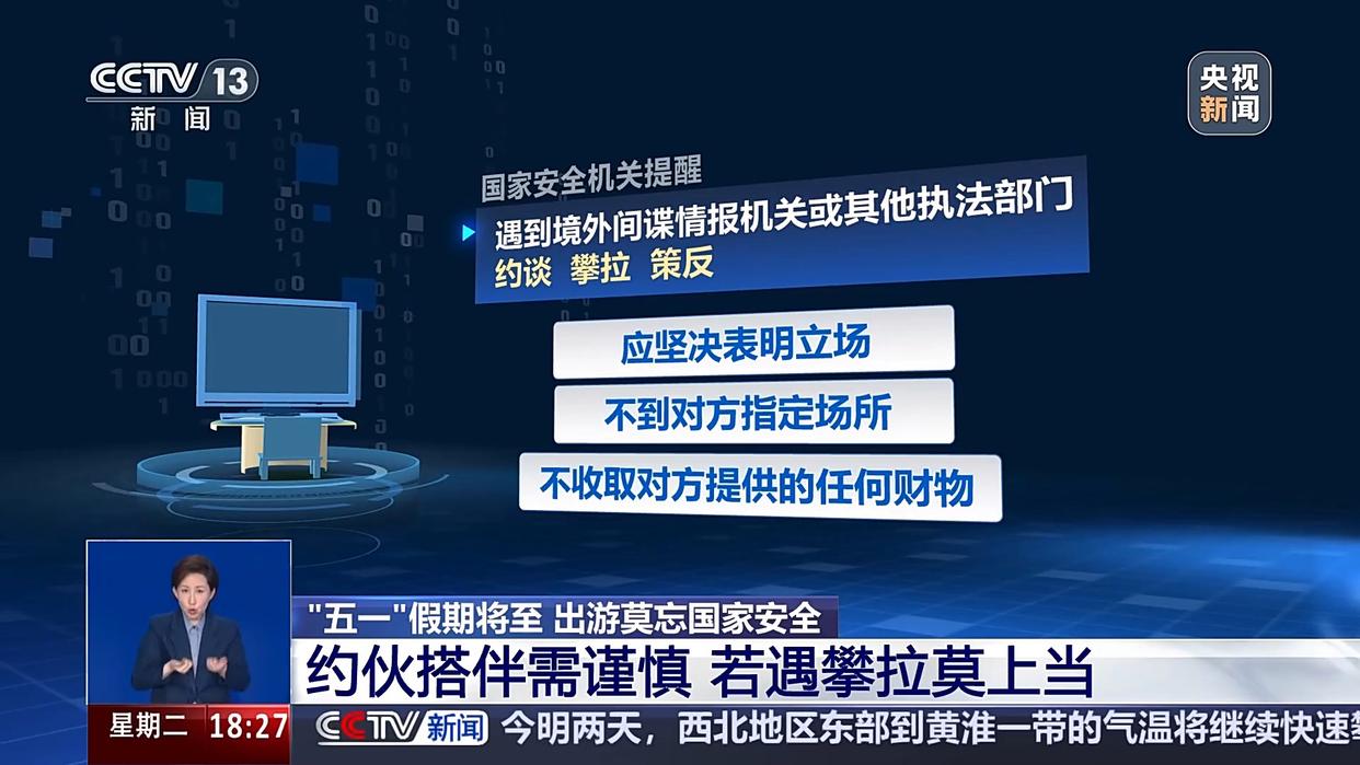 遇到境外間諜情報機(jī)關(guān)或其他執(zhí)法部門約談、攀拉、策反,應(yīng)堅(jiān)決表明立場,不到對方指定場所,不收取對方提供的任何財(cái)物,不簽署任何文件,不透露任何內(nèi)部信息,堅(jiān)持要求聯(lián)系我國駐外使領(lǐng)館尋求領(lǐng)事保護(hù)。