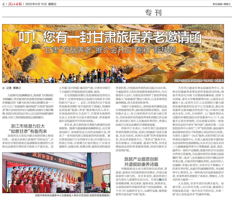 作為中國最大的游客輸出省之一,浙江始終是甘肅極為看重的優(yōu)質(zhì)客源地。隨著2025年度的夏季避暑游高峰期將近,6月15日,“如意康養(yǎng)·漫享隴原”甘肅省“旅居養(yǎng)老”推介會(huì)正式走進(jìn)杭州,本次大會(huì)由甘肅省民政廳、甘肅省老齡協(xié)會(huì)主辦,甘肅省福利彩票發(fā)行管理中心協(xié)辦,來自浙隴兩地民政部門、養(yǎng)老機(jī)構(gòu)、旅行社、新聞媒體圈的數(shù)百位嘉賓與市民游客參加了本次推介活動(dòng)。