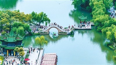 隨著“蘇超”破圈,江蘇揚州借勢發(fā)力,推出“看球+賞景”文旅套餐,圖為游客在瘦西湖風(fēng)景區(qū)賞景游玩。