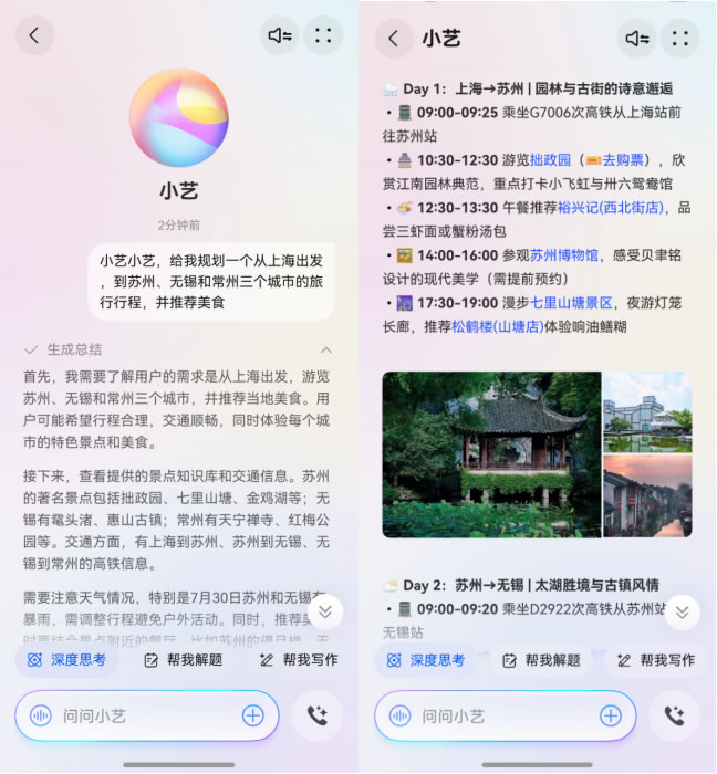 對(duì)于多城聯(lián)游來(lái)說(shuō),行程規(guī)劃十分復(fù)雜。在鴻蒙5的加持下,擁有全新大腦的對(duì)話思考式小藝變得“更聰明”,能理解用戶需求并給出針對(duì)性的回答。用戶只需對(duì)小藝說(shuō)出需求,例如:“小藝小藝,給我規(guī)劃一個(gè)蘇錫常園林和美食主題三日游。”小藝便能迅速生成一份詳盡的圖文攻略,將蘇州的古典園林、無(wú)錫的太湖風(fēng)光,以及常州獨(dú)具特色的中華恐龍園都囊括其中,給出路線、交通、美食等建議。旅途中遇到感興趣的建筑或是不認(rèn)識(shí)的植物,也可以隨時(shí)拍照后拖給小藝或圈選屏幕問(wèn)問(wèn)小藝,即時(shí)獲得百科解答,讓旅途充滿探索的樂趣。