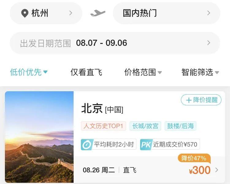 8月7日,記者查詢第三方售票平臺(tái)發(fā)現(xiàn),8月26日杭州飛北京經(jīng)濟(jì)艙機(jī)票價(jià)格僅需300元(不含稅),相當(dāng)于打了1.3折。8月13日,杭州飛揭陽(yáng)經(jīng)濟(jì)艙票價(jià)最低僅需370元(不含稅),相當(dāng)于打3.1折。8月27日,杭州出發(fā)飛石家莊票價(jià)最低僅需330元(不含稅),相當(dāng)于打2折。