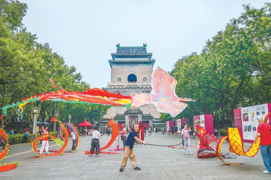 古老的鐘樓前,市民舞動龍鳳彩帶健身休閑,傳統(tǒng)韻味與現(xiàn)代活力在此交融。 本報記者 武亦彬攝