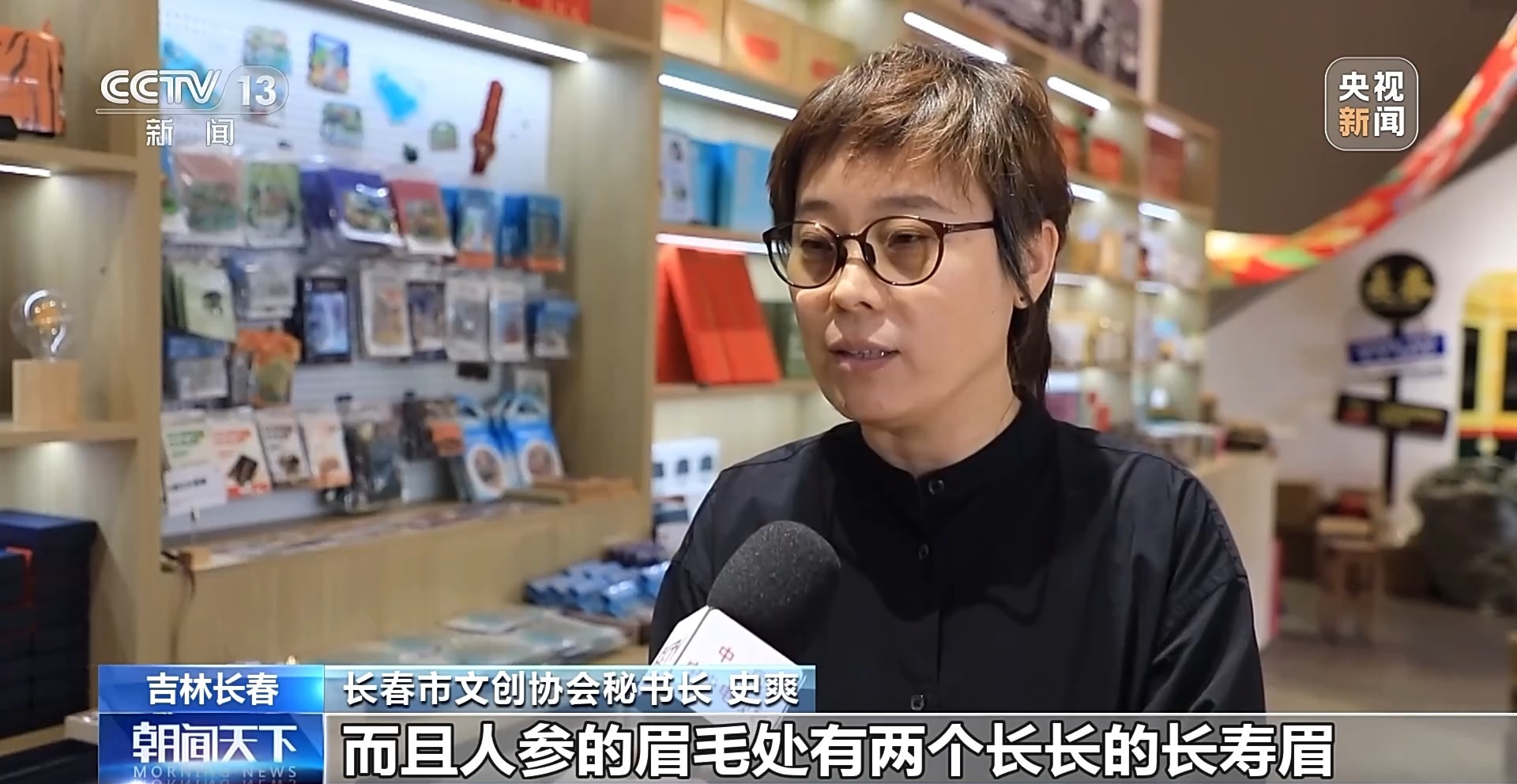 長春市文創(chuàng)協(xié)會秘書長 史爽:因?yàn)槲覀兗质∈侨藚⒌闹饕a(chǎn)地,上面的紅圍脖結(jié)合了我們原有的人參典故,系紅繩的這樣的一個典故,而且人參的這眉毛處有兩條長長的長壽眉,象征著吉祥如意。