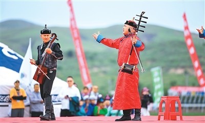 演員在內(nèi)蒙古自治區(qū)第十一屆少數(shù)民族傳統(tǒng)體育運(yùn)動會(巴林右旗分賽場)開賽儀式上表演。