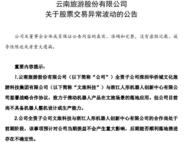 根據(jù)云南旅游22日盤后發(fā)布的異動(dòng)公告,目前,雙方合作尚處于前期階段,該事項(xiàng)預(yù)計(jì)對(duì)公司當(dāng)期損益不會(huì)產(chǎn)生重大影響,后期能否順利落地推進(jìn)存在不確定性。另外,公司目前尚不具備機(jī)器人整機(jī)設(shè)計(jì)或生產(chǎn)能力。