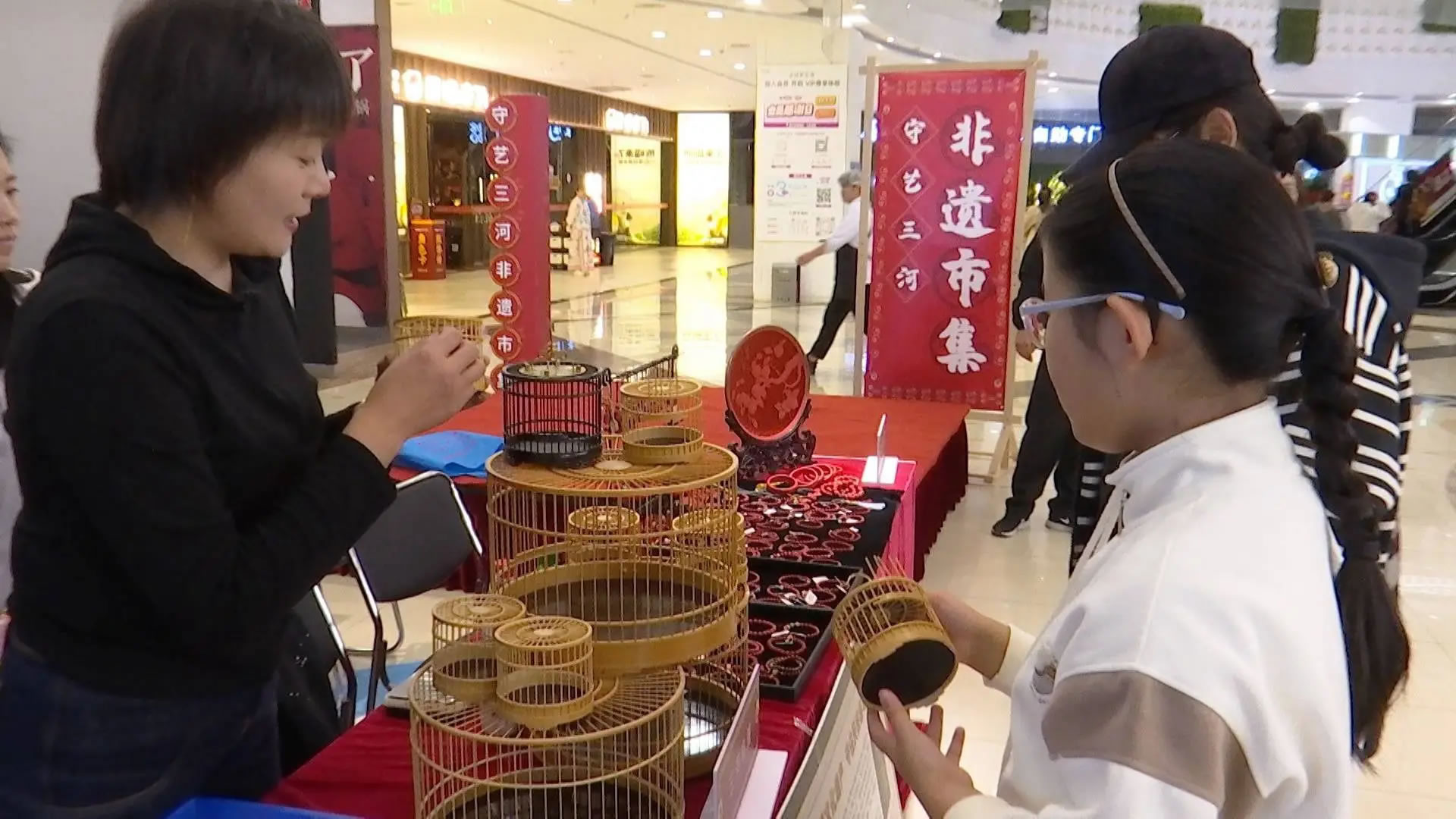 在三河喬鳥(niǎo)籠的攤位前,非遺傳承人正耐心地為一位小朋友講解鳥(niǎo)籠的制作奧秘,從選料到打磨,再到微小部件的精密組裝,精湛的技藝讓充滿好奇的孩子驚嘆不已。與此同時(shí),在商場(chǎng)一樓的“守藝三河”非遺精品展示區(qū),包括鼻煙壺、三河喬鳥(niǎo)籠在內(nèi)的多項(xiàng)非遺產(chǎn)品,吸引著往來(lái)顧客的目光。
