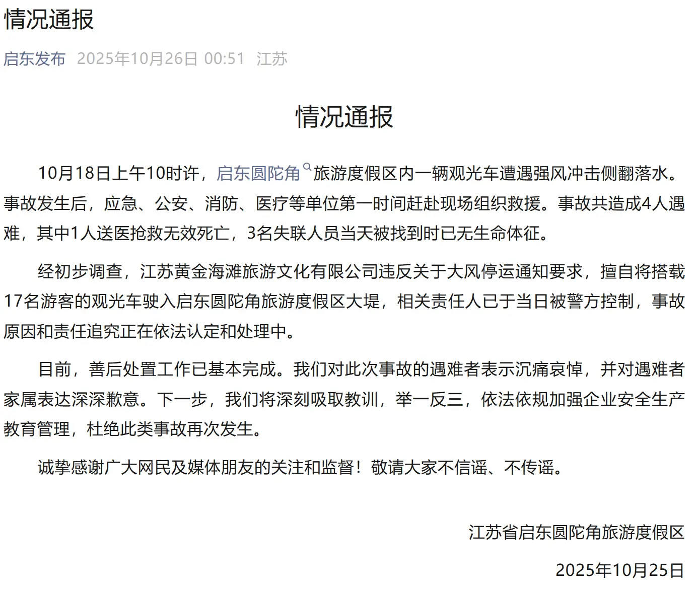 該通報(bào)稱,10月18日上午10時(shí)許,啟東圓陀角旅游度假區(qū)內(nèi)一輛觀光車(chē)遭遇強(qiáng)風(fēng)沖擊側(cè)翻落水。事故發(fā)生后,應(yīng)急、公安、消防、醫(yī)療等單位第一時(shí)間趕赴現(xiàn)場(chǎng)組織救援。事故共造成4人遇難,其中1人送醫(yī)搶救無(wú)效死亡,3名失聯(lián)人員當(dāng)天被找到時(shí)已無(wú)生命體征。