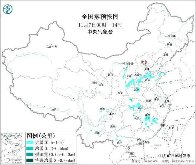 中央氣象臺今天(11月7日)06時(shí)繼續(xù)發(fā)布大霧黃色預(yù)警:預(yù)計(jì),7日早晨至上午,河北南部、河南中北部、山東北部和東部、山西南部、湖北南部、江西中部、福建西北部等地的部分地區(qū)有大霧,其中,山東東部、江西中西部、福建西北部等地的部分地區(qū)有能見度不足500米的濃霧,局地有能見度不足200米的強(qiáng)濃霧。