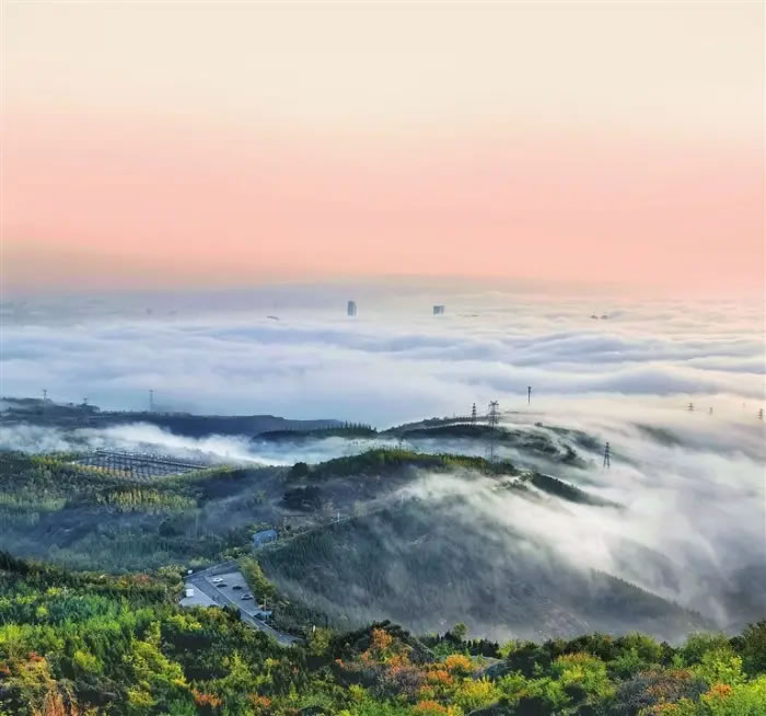 清晨6時(shí)許,市民高勁鵬與朋友驅(qū)車前往西山萬(wàn)畝生態(tài)園。沿途霧氣彌漫,山路蜿蜒間,紅黃綠相間的植被頻頻躍入眼簾,偶有靈動(dòng)的松鼠從山路旁躥出又疾速消失在馬路對(duì)面,遠(yuǎn)處山巒影影綽綽,“人在畫中游”的韻味十足。汽車快抵達(dá)山頂時(shí),眼前的濃霧突然消散,淡藍(lán)色天空下,云海如流水般在城市上空鋪開。遠(yuǎn)處,云層翻涌似海浪;近處,沿山霧帶若玉帶流動(dòng),高壓電線塔頂端與零星高樓在霧中時(shí)隱時(shí)現(xiàn)。
