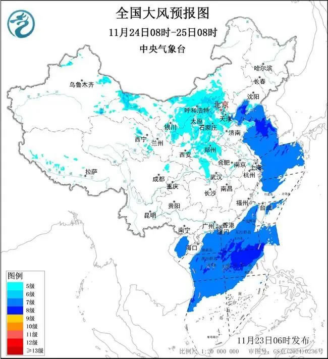 11月24日08時(shí)至25日08時(shí),內(nèi)蒙古中西部、甘肅北部、青海東北部、西北地區(qū)東部、華北等地的部分地區(qū)有5~7級(jí)大風(fēng),陣風(fēng)8~9級(jí),黃淮北部和西部、江漢等地的部分地區(qū)有5~6級(jí)大風(fēng),局部地區(qū)陣風(fēng)7~8級(jí);渤海、黃海中部和南部局地、南海北部和中部海域?qū)⒂?~8級(jí)、陣風(fēng)9~10級(jí)的大風(fēng)。