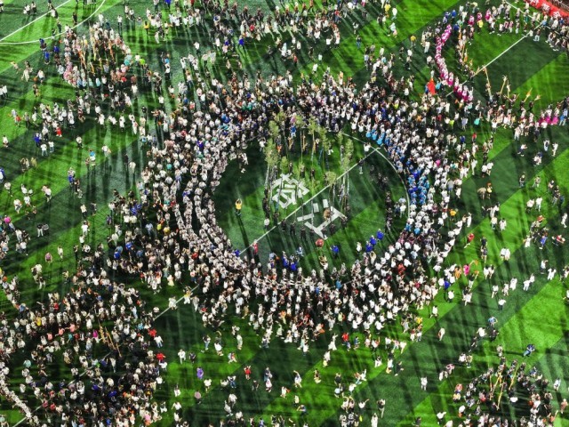 8月23日,人們?cè)谫F州“村超”球場(chǎng)跳苗族蘆笙舞(無人機(jī)照片)。新華社記者楊文斌 攝