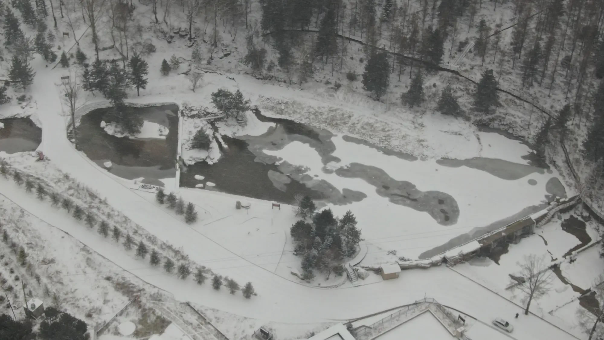 溪流與瀑布是雪中最靈動(dòng)的景致。十里清溪在皚皚白雪間蜿蜒,水面蒸騰的薄霧與雪氣交融,讓溪流似隱似現(xiàn),宛如銀綢纏繞山間。小型瀑布部分凝結(jié)成冰,晶瑩的冰掛與流動(dòng)的溪水相映成趣,水珠滴落時(shí)濺起的水花沾在石上,瞬間凝成冰晶,構(gòu)成動(dòng)靜結(jié)合的畫面。溪邊的苔石被積雪覆蓋,只露出邊緣的青黑,與白雪形成強(qiáng)烈對(duì)比。