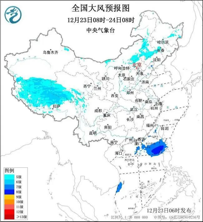 預(yù)計(jì),12月23日08時(shí)至24日8時(shí),內(nèi)蒙古中東部、華北北部、黑龍江中東部、吉林西部、遼寧北部及遼東半島、新疆北疆東部及南疆盆地山區(qū)、青海南部、西藏中北部等地有5~6級(jí)風(fēng),陣風(fēng)7~8級(jí);巴士海峽、南海東北部將有7~8級(jí)、陣風(fēng)9級(jí)的大風(fēng),渤海東北部局地海域?qū)⒂?級(jí)、陣風(fēng)8級(jí)的大風(fēng)。