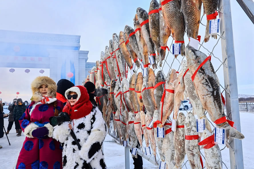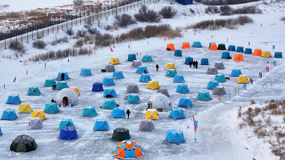 活動融合冰釣體驗、民俗展演與文化展示等,為游客打造了一場集運動、美食、互動于一體的沉浸式冰雪文旅盛宴。作為核心項目,中俄界河冰釣與冰捕區(qū)備受矚目。界河之上,五顏六色的暖帳錯落排布,冰釣愛好者早已按捺不住垂釣熱情,在帳篷內(nèi)生起暖爐、鑿開冰面、下好魚餌,支起小板凳,靜觀浮漂等候“佳音”。
