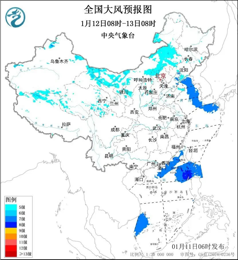 預計,1月11日08時至12日08時,內蒙古中西部、甘肅西部、寧夏北部、華北北部、山東半島、遼東半島、西藏中北部等地部分地區(qū)有5~7級大風、陣風8~10級;渤海、渤海海峽、黃海大部海域、東海大部海域、臺灣海峽、巴士海峽、南海大部海域將有7~8級、陣風9級的風,其中,臺灣海峽、巴士海峽、南海東北部的部分海域將有9級、陣風10級的大風。
