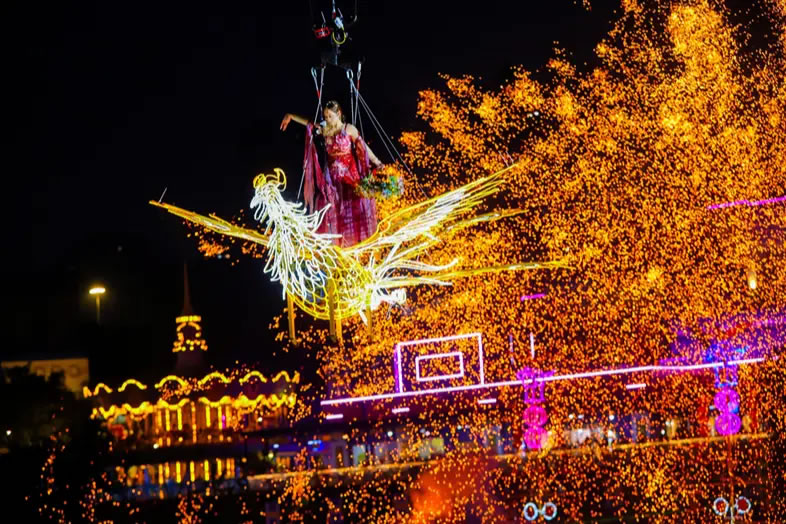 重慶歡樂谷舉行了新春大妙會活動,集水陸空立體非遺大秀、百場非遺演藝、多種民俗互動、年味萬福市集等于一體,以傳統(tǒng)與現(xiàn)代碰撞的獨(dú)特魅力為游客奉上沉浸式的地道年味體驗(yàn)。其中,非遺大秀在夜幕中璀璨亮相,1600℃的鐵水揮灑成漫天花火,演員化身“天女”撒下花瓣雨,湖面的龍船、火鳳凰、風(fēng)火輪等裝置火光綻放,光影成趣,水陸空一體聯(lián)動,驚艷絕倫;川劇變臉、潮汕英歌舞、福建游神、電音三太子等百場非遺演藝,讓游客可一站式領(lǐng)略全國傳統(tǒng)文化魅力,吸引絡(luò)繹不絕的游客前往。