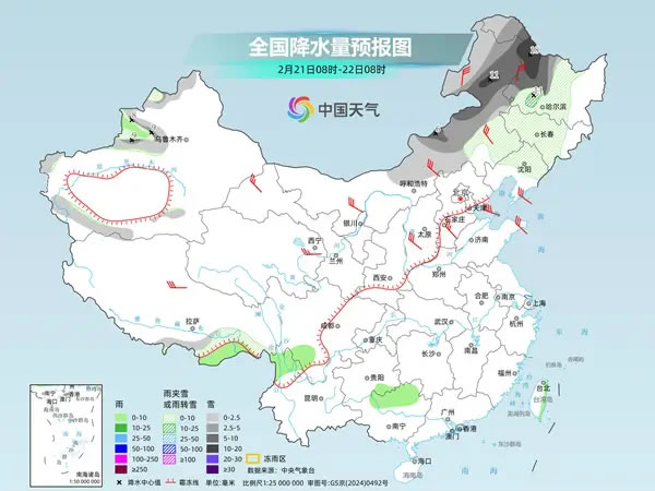中央氣象臺預(yù)計,今天,內(nèi)蒙古中東部、東北地區(qū)中西部、新疆伊犁河谷等地部分地區(qū)有小到中雪或雨夾雪,其中,內(nèi)蒙古東北部和中部、黑龍江西部等地部分地區(qū)有大到暴雪。新疆伊犁河谷、西藏南部、四川南部、貴州東南部、云南西北部、廣西北部、臺灣島東部等地部分地區(qū)有小雨。
