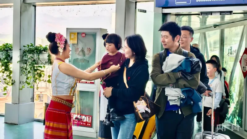 西雙版納機(jī)場(chǎng)工作人員為到達(dá)旅客送上香囊(央廣網(wǎng)發(fā) 西雙版納機(jī)場(chǎng)供圖)