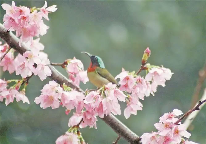 2000余株山櫻花已在天竺山四季花谷中陸續(xù)蘇醒,粉白的吉野櫻和玫紅的山櫻,共同組成了停駐在枝頭的粉色“云霞”。
