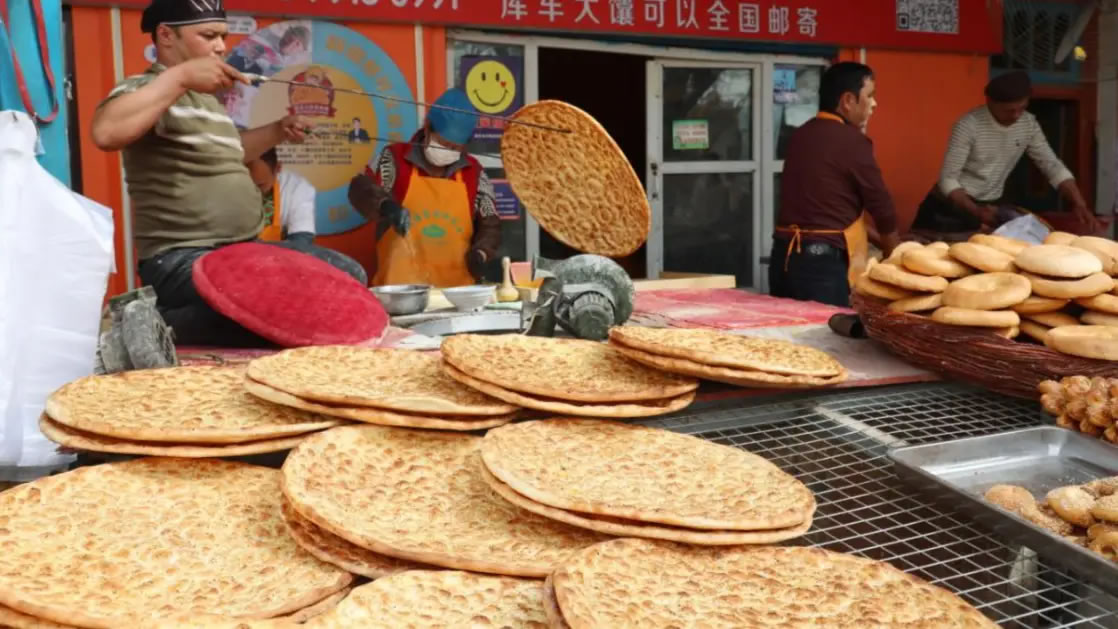 打馕師傅們在店前的操作臺前忙碌,揉面、塑形、戳花、入爐,一道道工序嫻熟流暢,剛從馕坑中取出的大馕色澤金黃、紋路清晰,堆疊在貨架上,成為街頭最誘人的風(fēng)景。不少游客提著剛打包好的大馕,臉上洋溢著滿足的笑容,有的高舉大馕與老街同框合影,用鏡頭記錄下這份地道的新疆風(fēng)味。