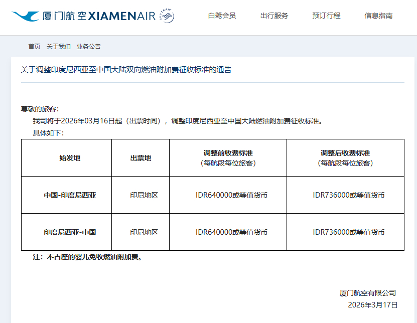 此外,廈門航空3月17日宣布,于2026年03月16日起(出票時間),印度尼西亞至中國大陸燃油附加費征收標準由640000印尼盾(約合人民幣259元)調(diào)整為736000印尼盾(約合人民幣298元),調(diào)整幅度為15%。