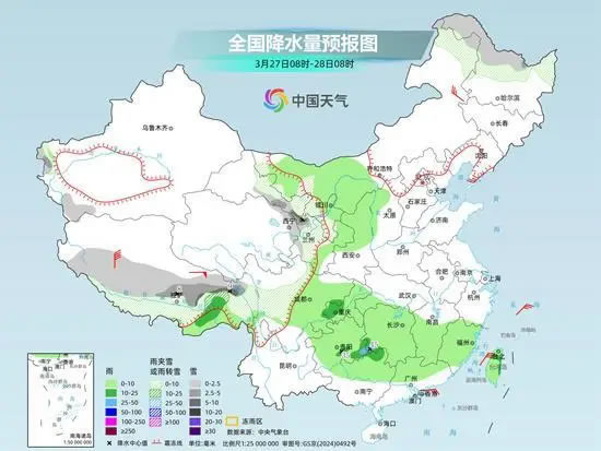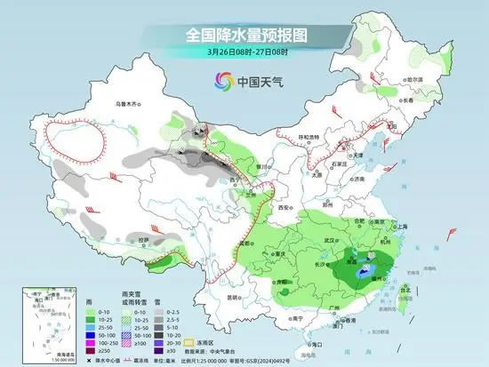 未來三天,南方仍有較大范圍陰雨天氣,西南地區(qū)東部、江南、華南北部等地有中到大雨,貴州中南部、湖南中部、江西中部、福建北部等地局地有暴雨,上述地區(qū)局地伴有短時(shí)強(qiáng)降水或風(fēng)雹天氣。此外,青藏高原東部多雨雪天氣,新疆沿天山高海拔山區(qū)有中到大雪,局地有暴雪或大暴雪。