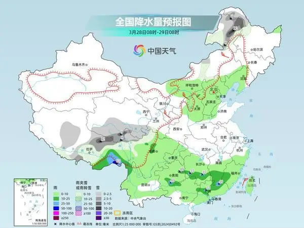 明天,內(nèi)蒙古東北部、黑龍江西北部和中部、吉林東部、新疆南部、西藏西部、青海東部和西部、甘肅南部、川西高原北部等地部分地區(qū)有小到中雪或雨夾雪,其中,內(nèi)蒙古東北部、黑龍江西北部、青海東部、新疆南部等地部分地區(qū)有大雪或暴雪。西北地區(qū)東南部、江淮西部、江漢南部、江南大部、華南北部及重慶東部、貴州東部等地部分地區(qū)有中到大雨,其中,湖南西部和東北部、江西中北部等地部分地區(qū)有暴雨或大暴雨。