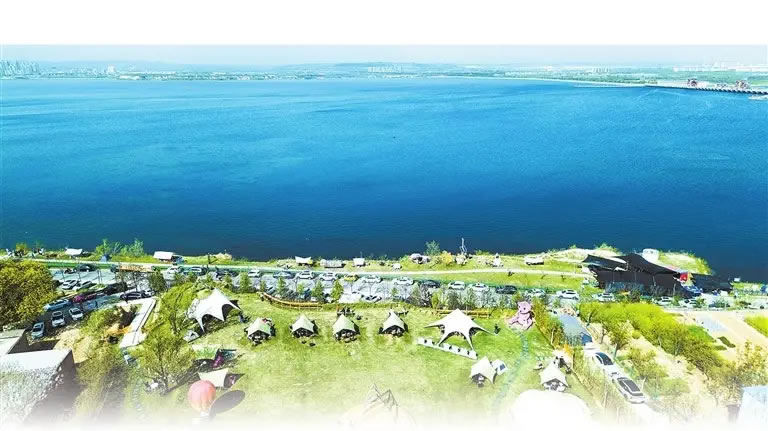 4月5日,游客在洛陽市孟津區(qū)白鶴鎮(zhèn)境內(nèi)的黃河生態(tài)廊道生態(tài)觀景平臺(tái)和觀光驛站露營(yíng)休閑。黃政偉 攝