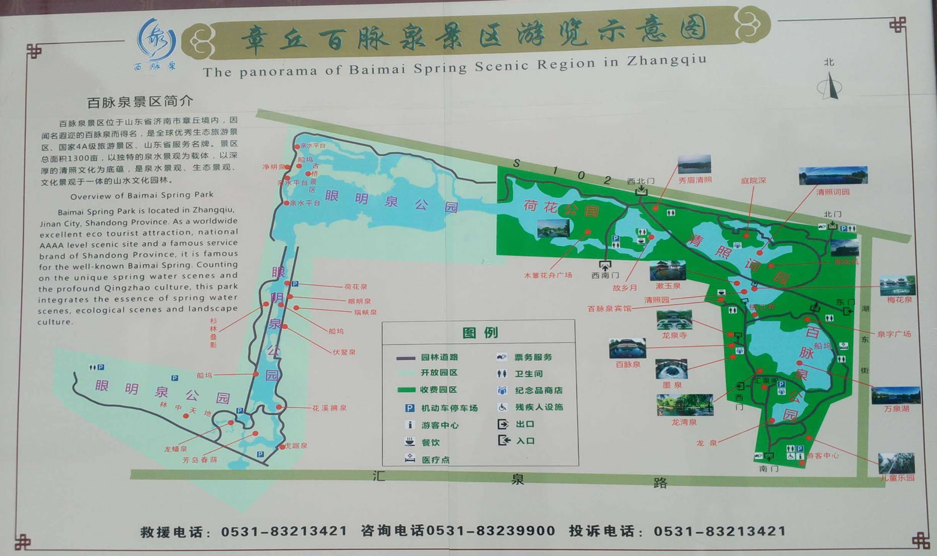 公園布局由著名園林專家孫筱祥先生設(shè)計,園名由已故著名書法大師舒同題寫。園內(nèi)噴泉5處,石拱橋3座,石土假山2座,石、木板平橋、各一架。并建有匯泉閣、湖心亭、船塢碼頭等。公園景點布局因地緣勢,順水流向,逐次展開,設(shè)計獨特,構(gòu)思巧妙。全園分為泉水、花園、幽靜學(xué)習(xí)、林蔭散步、兒童樂園5個區(qū)。泉水區(qū):奇花異草,千姿百態(tài)、鳥語花香,競相斗艷。幽靜學(xué)習(xí)區(qū):環(huán)境幽雅,空氣清新,掩卷吟歌,浮想聯(lián)翩。密林散步區(qū):小橋流水,蜿蜒曲折,灌木叢生,暗柳成蔭。兒童樂園區(qū):游龍戲水,木馬滑梯,蕩秋千,跳蹦蹦床,高架橋,星空穿梭游藝機,樂不思歸。公園內(nèi)樓、臺、亭、榭、閣,點綴其間,錯落有致,相互輝映。假山、密林、湖水、斷橋,別有洞天,可謂“疑是山窮水無路,柳暗花明又一景”。濟南七十二名泉中的百脈泉乃園中勝景,公園也因之得名。1997年5月,又在園西北隅建成清照罷工(李清照紀念館),公園風(fēng)光無限,更添春色。百脈泉公園是鑲嵌在章丘大地上的一顆明珠。百脈泉公園,位于山東省濟南市章丘區(qū)明水境內(nèi),這里是龍山文化的發(fā)祥地,一代詞宗李清照的故里。