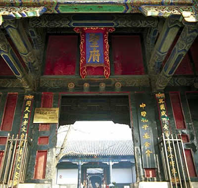 孔府位于曲阜城的中心,坐北朝南,迎面是一個粉白的大照壁,門前左右兩側(cè),有一對2米多高的圓雕雌雄石獅。紅邊黑漆的大門上鑲嵌著狻猊鋪首,大門正中上方的高懸著藍底金字的“圣府”匾額,門兩旁明柱上,懸掛著一對藍底金字對聯(lián):與國咸休安富尊榮公府第,同天并老文章道德圣人家。這副對聯(lián)相傳是清人紀均的手書。文佳字美,形象地說明了孔府在封建社會中的顯赫地位。這副對聯(lián)口氣之大自不待言,發(fā)人深思的是上聯(lián)“安富尊榮”的富字,下聯(lián)“文章道德”的章字,從上圖可以看出,“富”字上少了一 點,“章”字中多了一筆,意思是說衍圣公官職位列一品,田地萬 畝千頃,自然富貴沒了頂;孔子及其學說“德侔天地、道冠古今”,圣人之家的“禮樂法度”,也就能天地并存,日月同光。