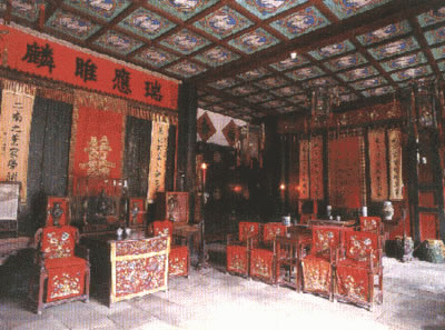 貪壁正北迎面就是正廳7間,名叫前上房。這是孔府主人接待至親和近支族人的客廳,也是他們舉行家宴和婚喪儀式的主要場所。院內(nèi)東西兩側(cè)各有一株茂盛的十里香樹,每當春夏相交時節(jié),潔白的花朵散發(fā)出陣陣清香,房前有一大月臺,四角放著四個帶鼻的石鼓,是當年府內(nèi)戲班唱戲時扎棚的腳石。清末孔府養(yǎng)著幾十人的戲班子,主人一聲令下,馬上開鑼唱戲。 前上房內(nèi),明間敞亮,正中高懸“宏開慈宇”的大匾,中堂之上,掛有一幅慈禧親筆寫的“壽”字。