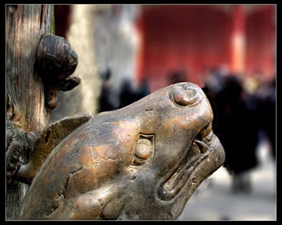 洙水橋北,先是一座綠瓦三楹的高臺大門——擋墓門,后面就到了供奉孔子木主的享殿。去享殿的甬道旁,有四對石雕,名曰華表、文豹、角端、翁仲。華表系墓前的石柱,又稱望柱;文豹,形象似豹,腋下噴火,溫順善良,用以守墓;角端,也是一種想象的怪獸,傳說日行1萬8千里,通四方語言,明外方幽遠之事;翁仲,石人像,傳為秦代驍將,威震邊塞,后為對稱,雕文、武兩像,均稱翁仲,用以守墓。兩對石獸為宋宣和年間所刻,翁仲是清雍正年間刻制的,文者執(zhí)笏,武者按劍。甬道正面是享殿,殿廣5間,黃瓦 歇山頂,前后廊式木架,檐下用重昂五踩斗栱。殿內現(xiàn)存清帝弘歷手書“謁孔林酹酒碑”,中有“教澤垂千古,泰山終未頹”等詩句。解放戰(zhàn)爭時,朱德總司令曾在此殿內召開過軍事會議。