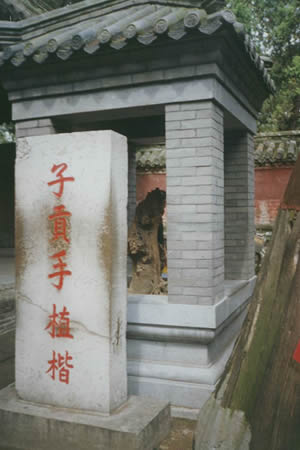 孔子墓西的3間西屋為子貢廬墓處?鬃铀篮,眾弟子守墓3年,相訣而去,獨子貢在此又守3年。后人為紀念此事,建屋3間,立碑一座,題為“子貢廬墓處!毕淼钪,另有一座灰瓦攢尖頂?shù)姆酵ぃQ“楷亭”。亭內石碑上刻著一棵古老的楷樹,即摹自其南側的“子貢手植楷”。相傳子貢奔喪來后,將一棵楷樹苗栽于其師墓旁,后成大樹。清康熙間遭雷火焚死,后人將枯干圖象刻于石上。