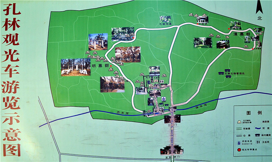 乾隆時又予擴大。孔子墓東為其子孔鯉墓,南為其孫孔伋墓,這種墓葬布局名為攜子抱孫。