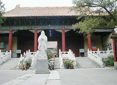 從杏壇北望,在雙層石欄的臺基上一座金黃色的大殿突兀凌空,雙重飛檐中海蘭色的豎匾上木刻貼金的群龍緊緊團護著3個金色大字“大成殿”。字徑1米,是清雍正皇帝的手書。